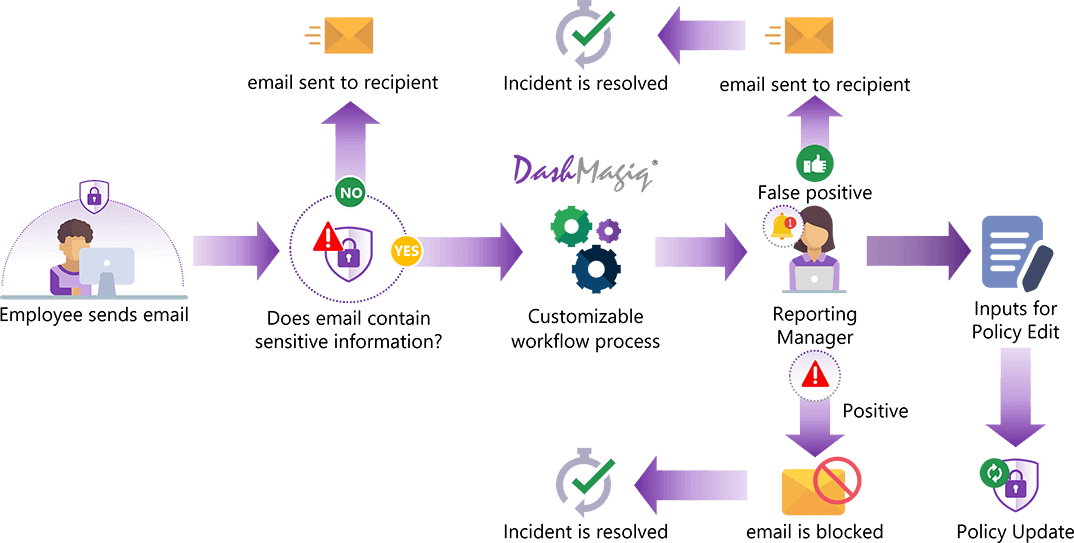 When an email is quarantined by a DLP solution, DashMagiq® Email Quarantine Workflow automatically notifies the sender's manager or an appropriate stakeholder. It automates the process of quarantine management by deleting or releasing emails based on the responses and decisions of the manager(s) or stakeholder(s). The workflow presents a questionnaire to the manager or stakeholder to record their decision and reasons. DashMagiq® automatically releases the email from the DLP and creates and stores the documentation necessary for compliance.